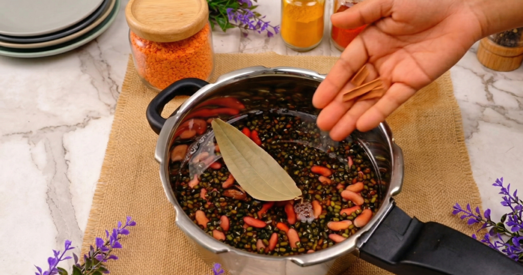Now, transfer the soaked lentils and kidney beans into a pressure cooker. Next, add approximately 5 cups of water, 1 bay leaf, and 2 cinnamon sticks.