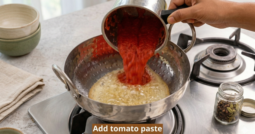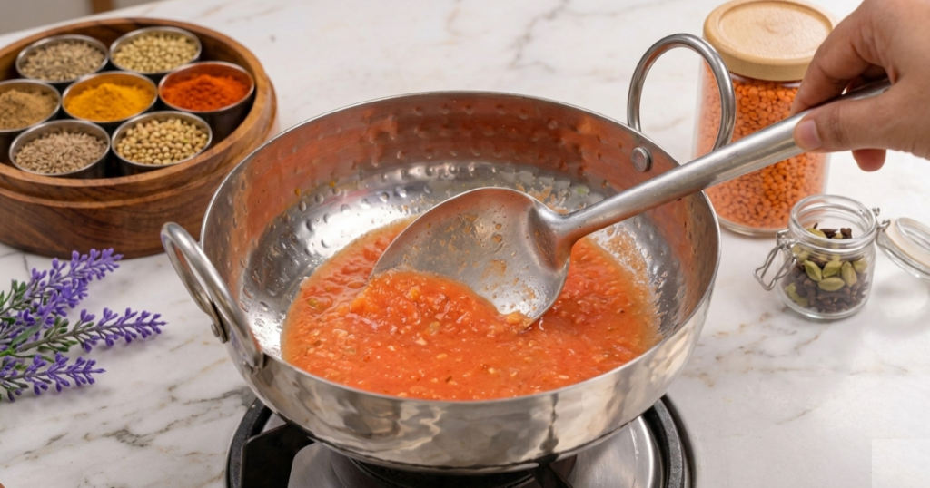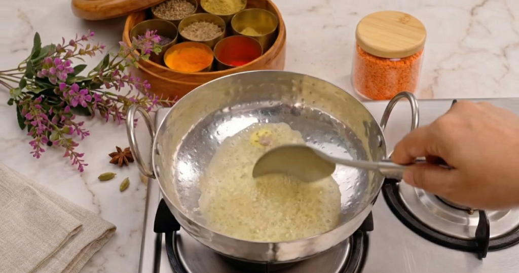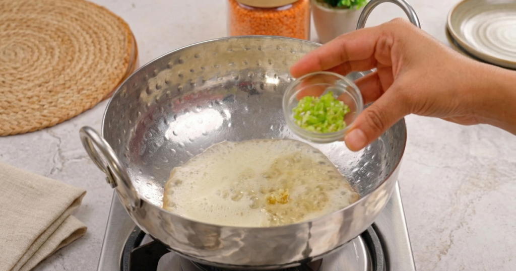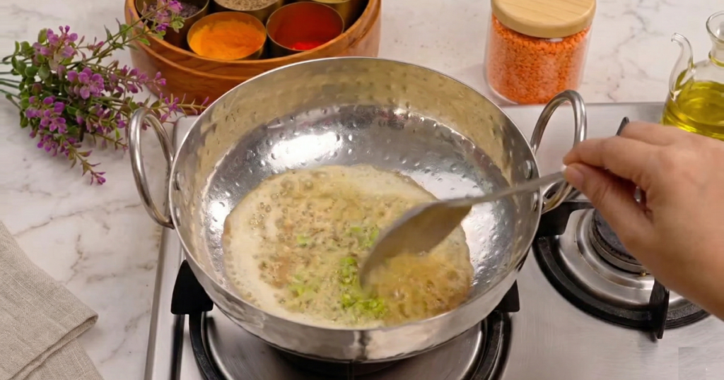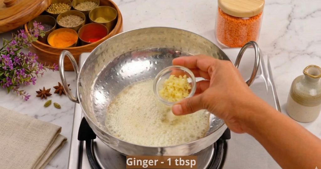 A paste of ginger and garlic is added to the lentils to enhance both their flavor and aroma. You can prepare this paste fresh at home by crushing the ingredients yourself, or you may opt to use a store-bought, ready-made paste.