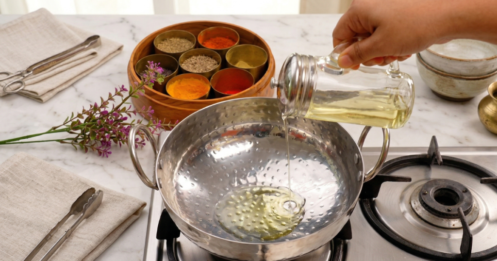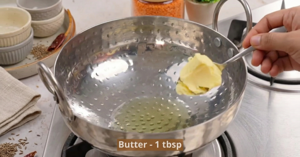 Now, heat a *kadhai* (wok) on the stove and add 2 tablespoons of oil and 1 tablespoon of butter. Butter plays a crucial role in the Dal Makhani recipe; therefore, it is essential to use it in the correct proportion to ensure the dal acquires a rich and creamy flavor.