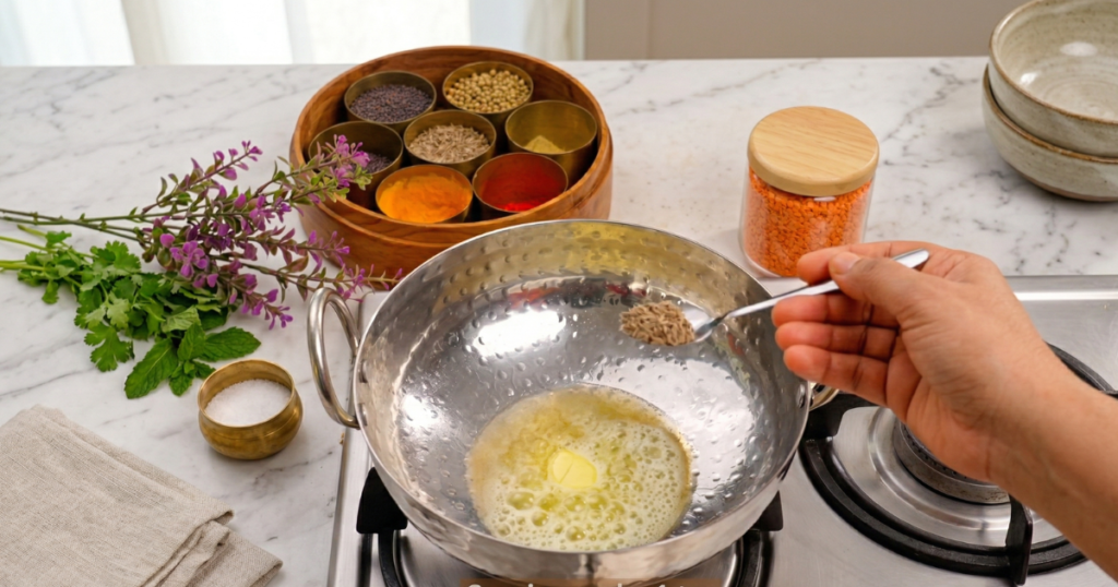 In this recipe, we offer a simplified approach to achieving that same *dhaba*-style taste: after cooking the lentils in the pressure cooker, they are transferred to a *kadai* and gently simmered with spices, allowing the distinct flavors of each spice to meld perfectly with the lentils.