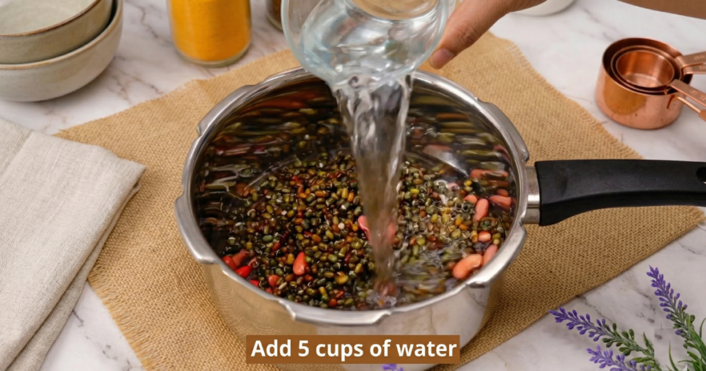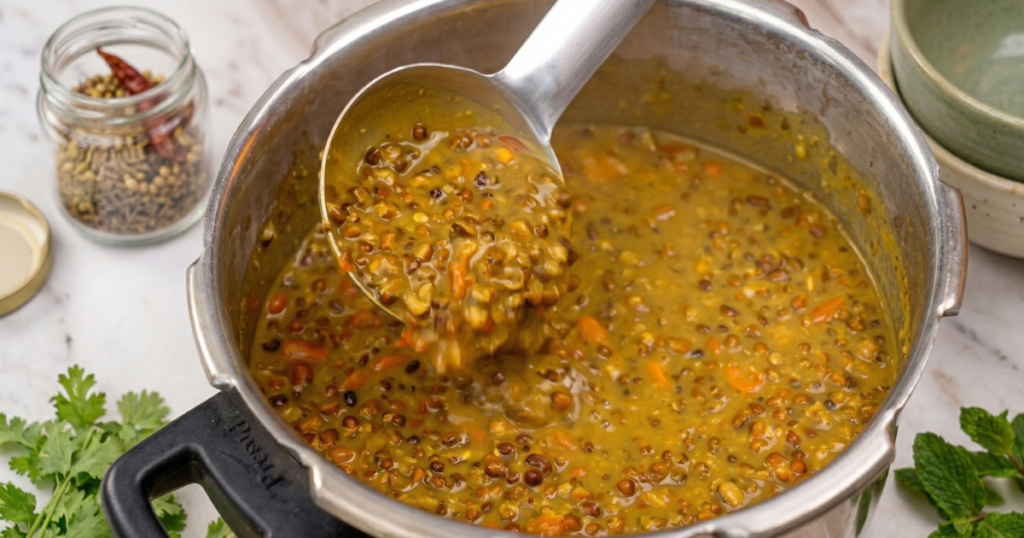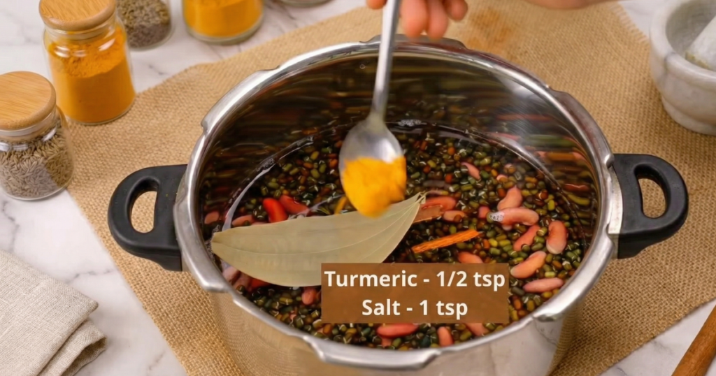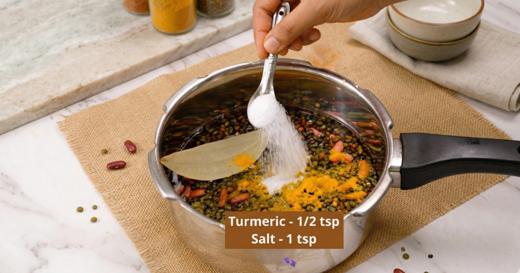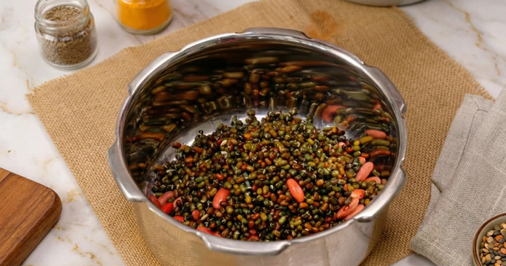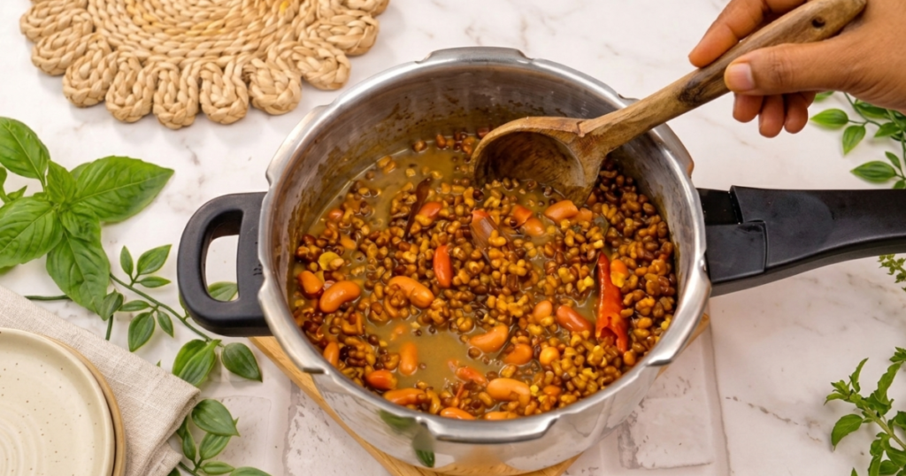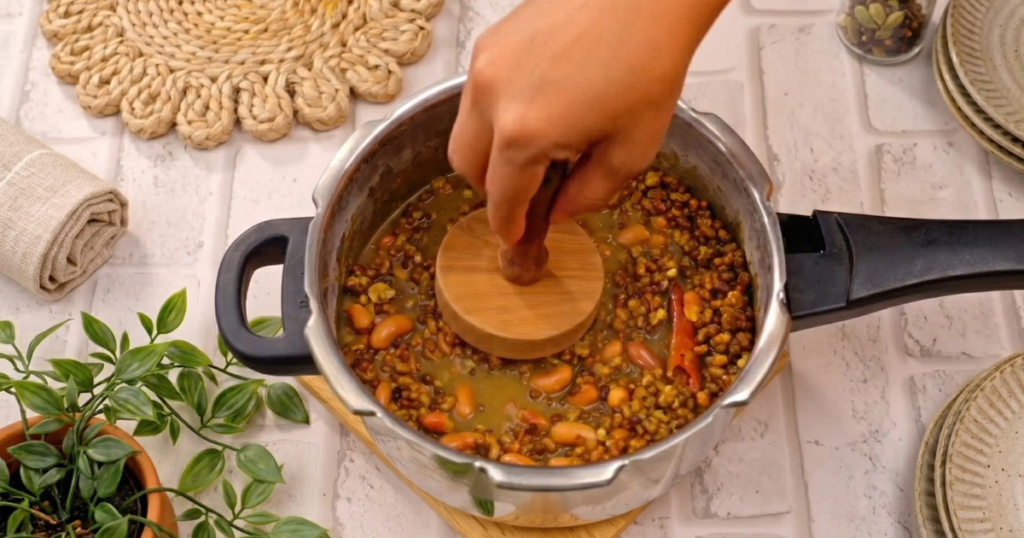 Next, open the lid of the cooker and check whether the lentils and kidney beans are thoroughly tender and cooked. If the lentils are not fully cooked, place the cooker back on the stove and let it whistle 1–2 more times.