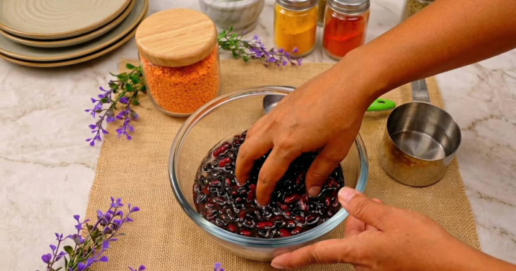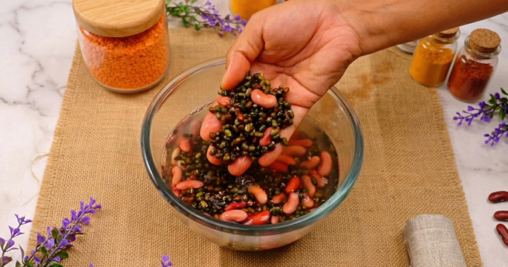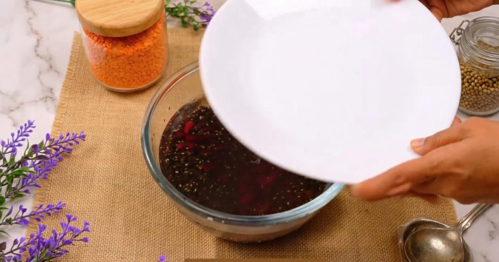 After rinsing, drain the water and add 3 cups of fresh water back into the same bowl. Now, cover the bowl and let the lentils and kidney beans soak for 10–12 hours.