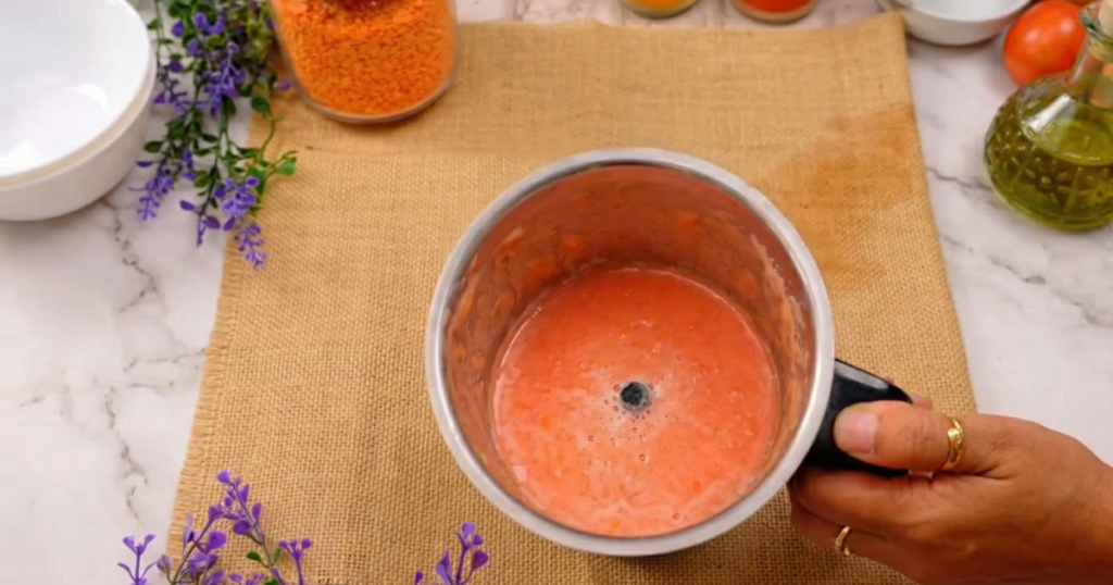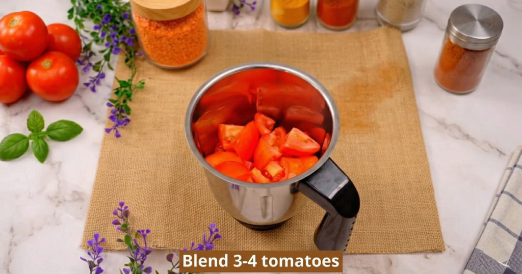 While the lentils are cooking in the pressure cooker, take 4 tomatoes and chop them into small pieces. Now, transfer the chopped tomatoes into a blender jar and blend them into a smooth puree.
